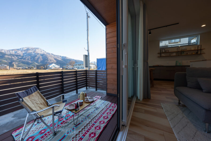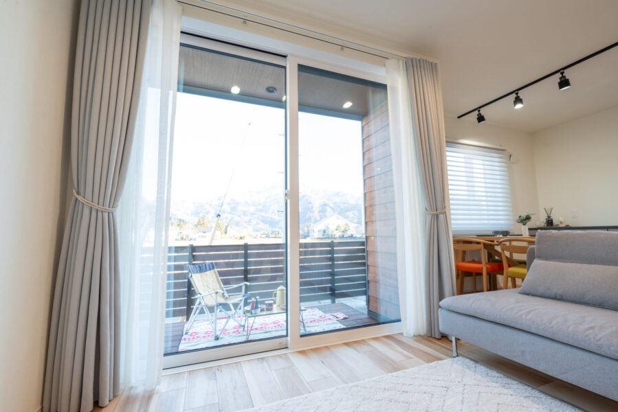 大きな窓で明るくしたリビングや、そこから繋がるウッドデッキ。