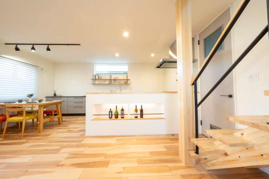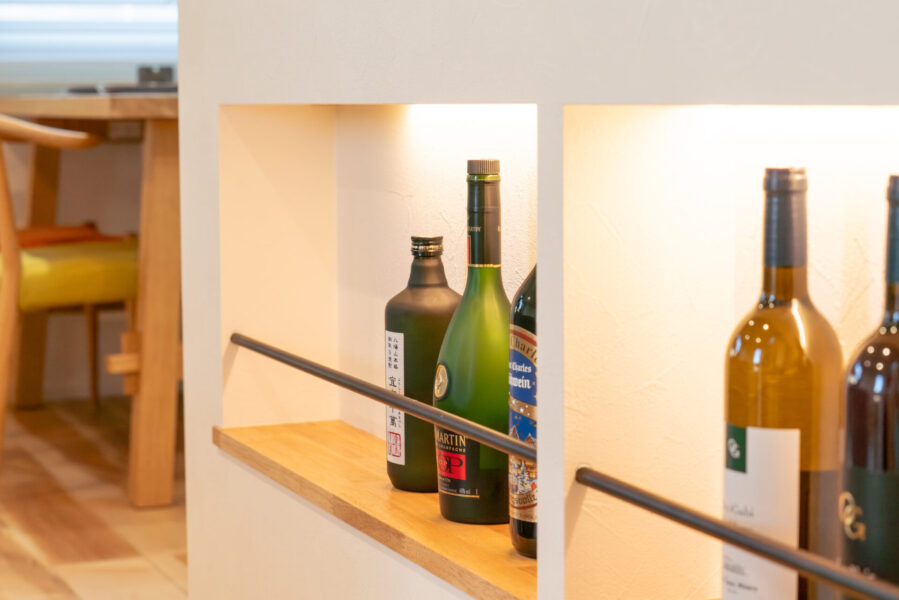 趣味の物を置ける飾り棚や間接照明付きウイスキーニッチ、メラミンを天板にした収納棚などこだわりを詰め込みました。