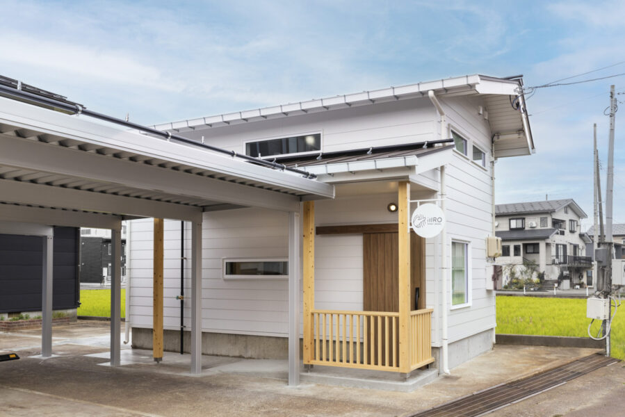 車庫兼物置だった部分を、白とナチュラルをベースにした居心地のよい空間にフルリノベーション。入口や店内の段差を解消し、手すりやスロープを完備することでバリアフリー対応に。